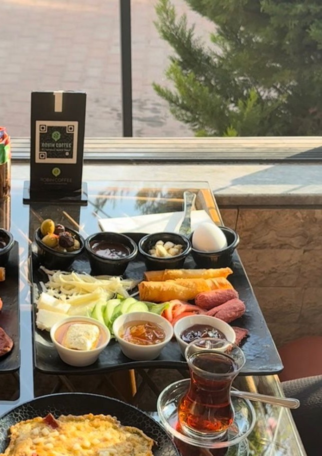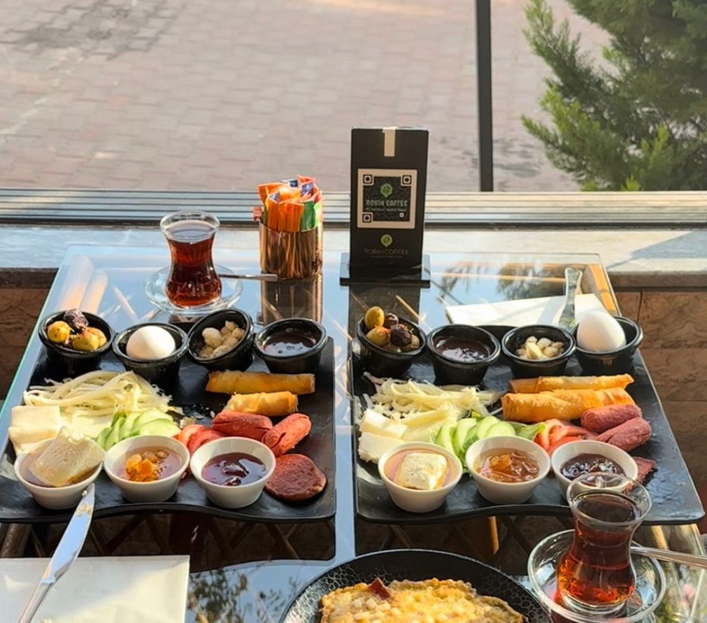 2 ayrı kahvaltı tabağı olarak servis edilir. Haşlanmış yumurta, tulum peyniri, kaşar peyniri, ezine peyniri, tel peynir, sucuk, sosis, 2 adet sigara böreği, yeşil zeytin, siyah zeytin, domates, salatalık, marul, bal, kaymak, portakal reçeli, çilek reçeli, çikolata, ekmek, poğaça, 1 bardak çay